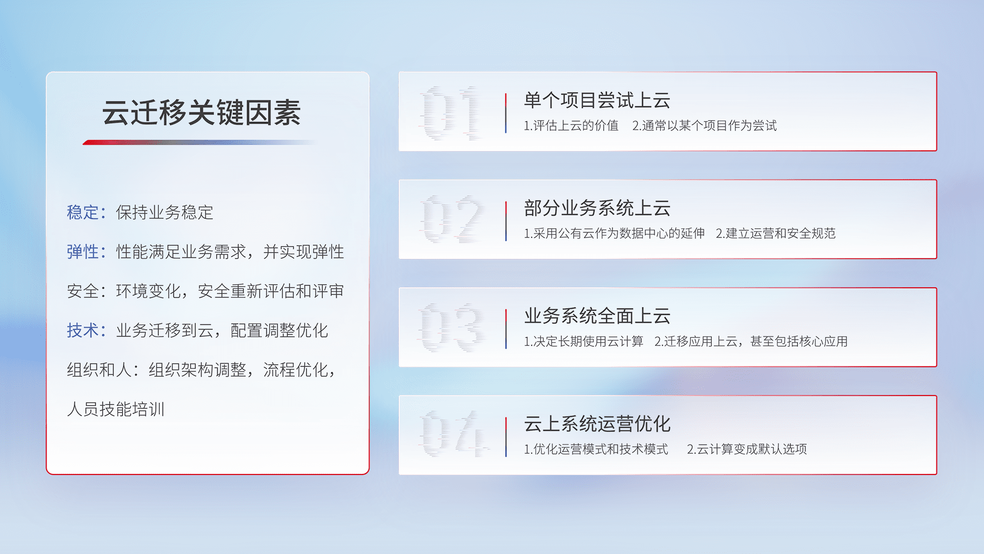 结合实际业务,,,,从规划设计、、、、云平台选型、、云原生改造、、数据迁移、、集成交付,,迁移全过程为客户识别最佳上云路径,,做好风险识别管理,,,设计网络架构、、身份权限、、、安全审计合规、、、、操作审计、、日志审计、、、监控告警策略、、、多站点容灾设计等,,,,对云上基础设施进行整体规划,,,提升IT治理水平,,,,以满足弹性、、、高可用、、高性能的需求。。。