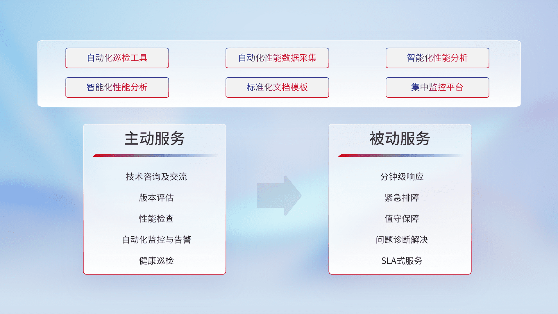 智能化工具和标准化文档,,保障服务质量,,,,提供主动服务(包含技术咨询、、、、版本评估、、、、性能检查、、、自动化监控与告警、、、健康巡检)和被动服务包含(分钟级响应、、紧急排障、、、、值守保障、、、、问题诊断解决、、、、SLA服务)。。。
