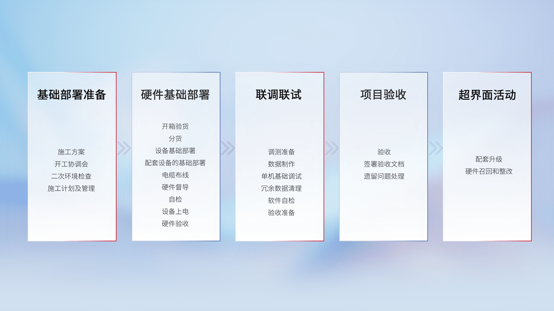 从基础部署准备、、硬件基础部署、、、、联调联试、、、项目验收、、、越界面活动的全过程可追溯,,,,保证施工质量和进度。。